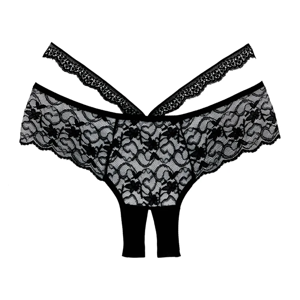 Een wervelwind van geschulpte kant bedekt je heupen en achterwerk in deze weelderige open kruis boy cut panty, met hoge kantbanden die schuin omhoog lopen om een zandloper-effect te creëren.