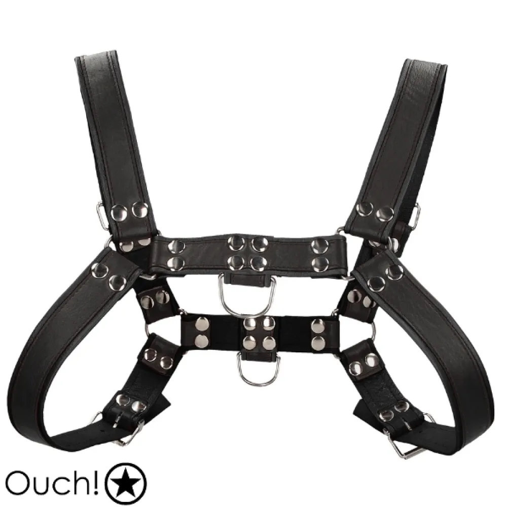Dit prachtige Bulldog harnas combineert leer met roestvrijstalen ringen en gespen om je borst en rug nog eens extra te accentueren.